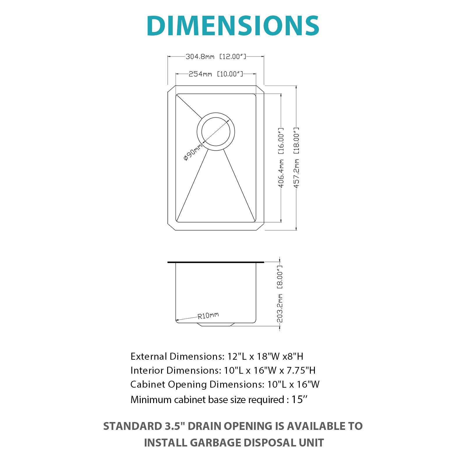 - Dimensions: Exterior size 12" x 18" x 8", interior dimensions 10" x 16", standard 3-1/2" drain opening for universal disposal fit