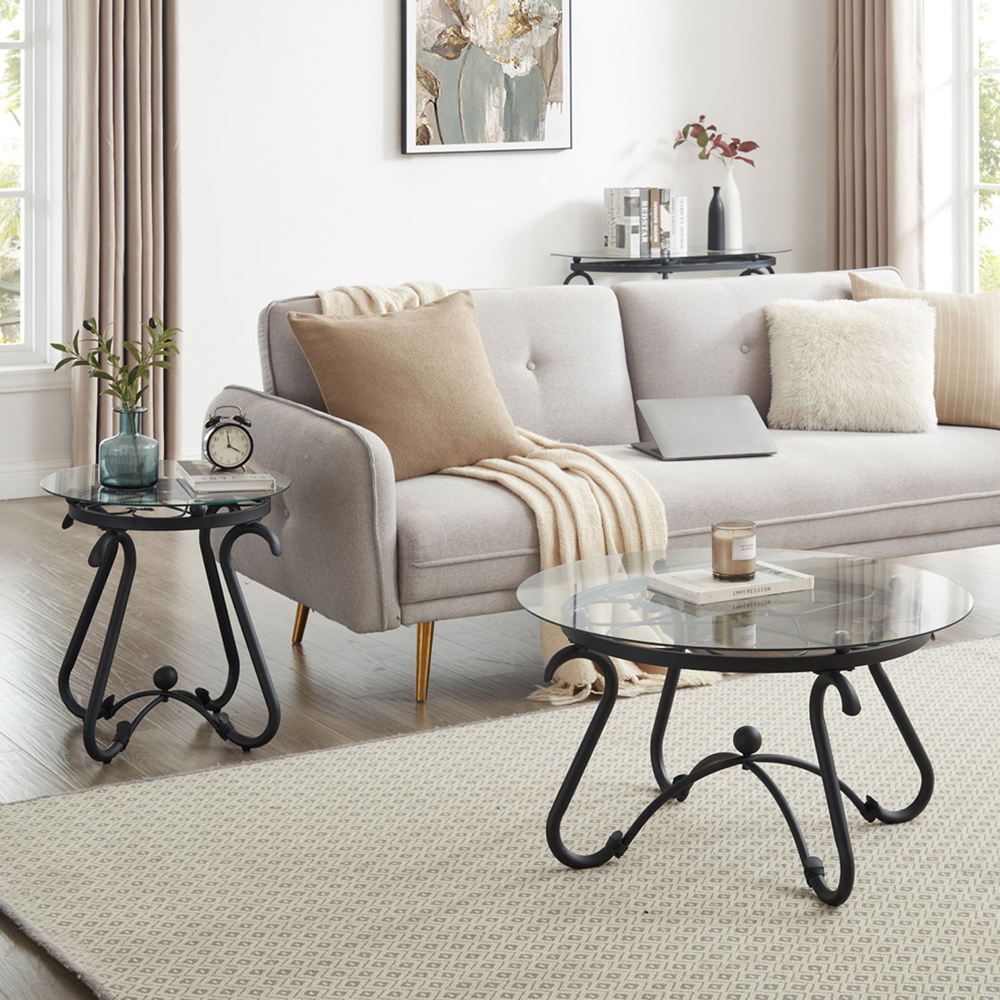 - Elegant Tempered Glass Surface: The coffee table set features a sophisticated tempered glass surface that adds a touch of elegance to your living room decor.