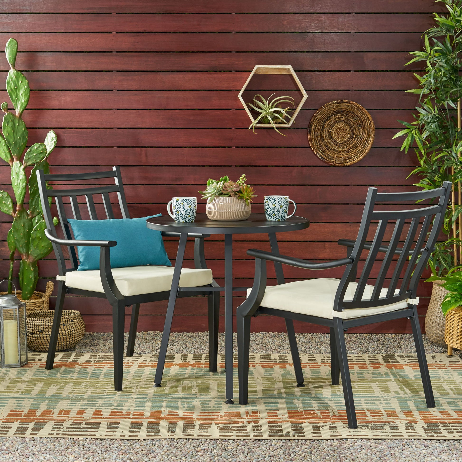 - Transitional Style: Designed with a minimalistic yet classic look, this bistro set features a slat design and curved armrests, seamlessly enhancing any outdoor arrangement.