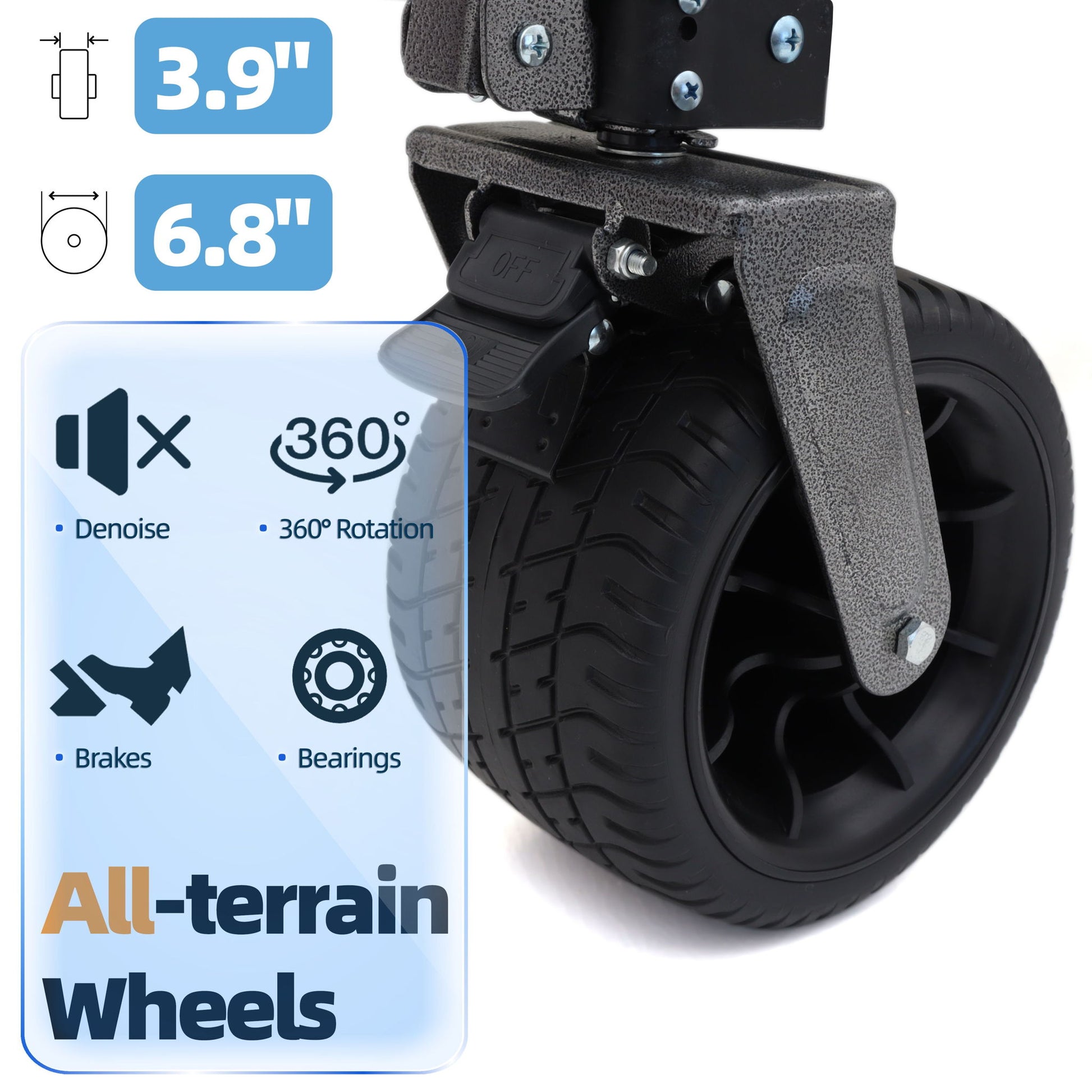 - All-Terrain Wheels: Equipped with four large wheels for smooth transportation over sand, gravel, grass, or other surfaces. The 360° rotating front wheels make pushing and pulling easy and convenient.