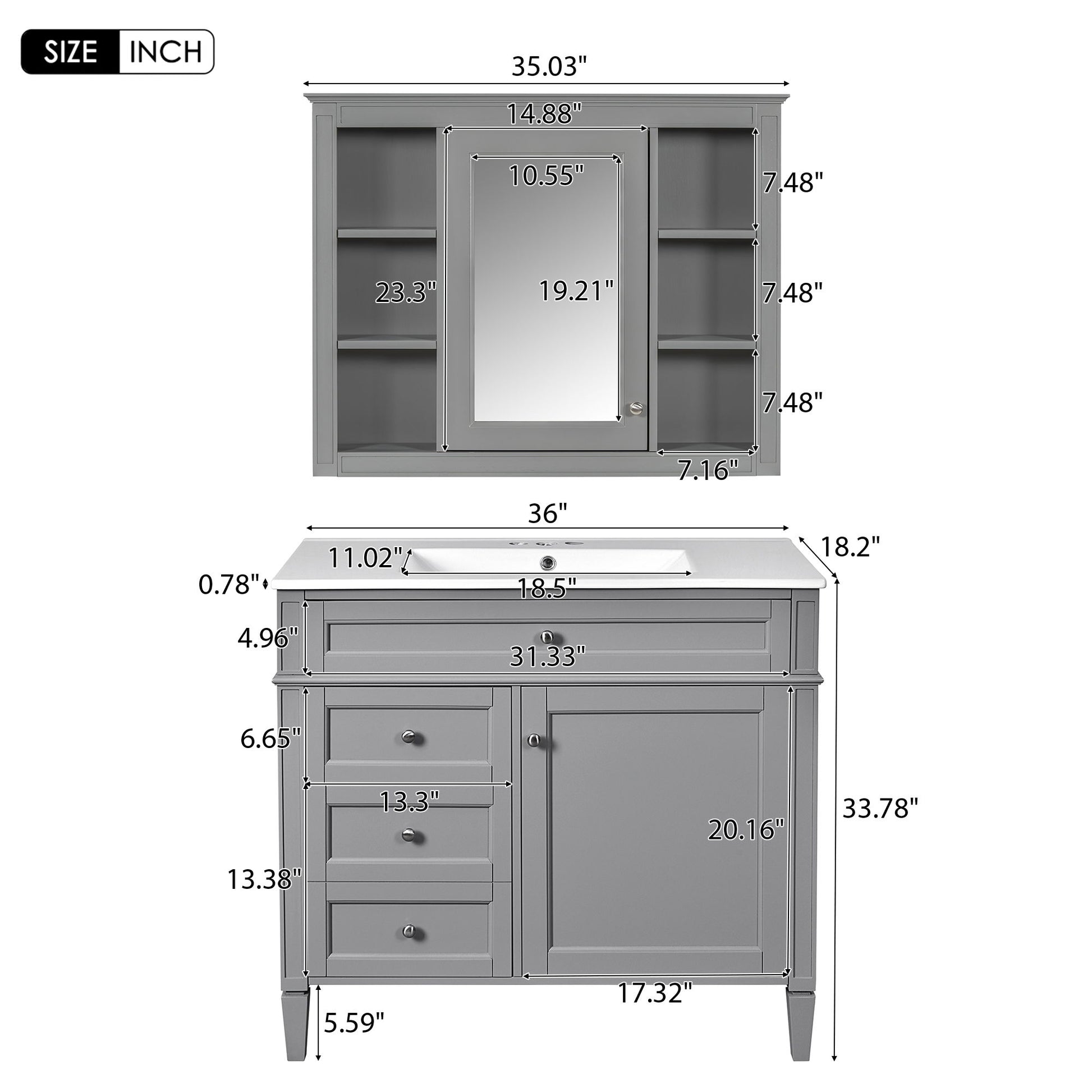 36" Bathroom Vanity With Mirror Cabinet, Storage Unit With 2 Soft Closing Doors And 4 Drawers, Drop In Sink - Gray