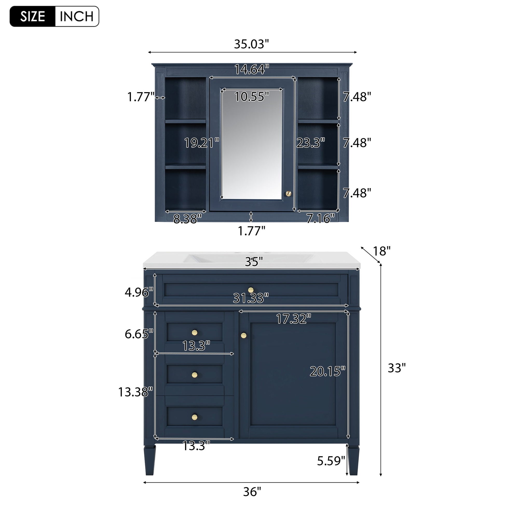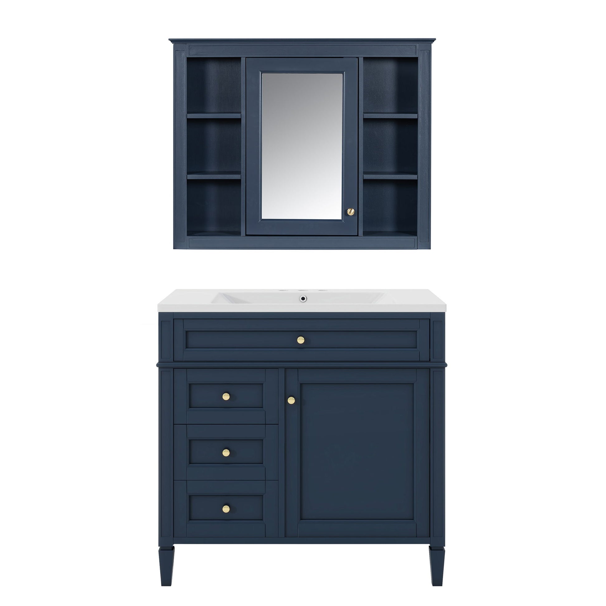 36" Bathroom Vanity With Mirror Cabinet, 2 Soft Closing Doors & 4 Drawers, Undermount Sink - Blue