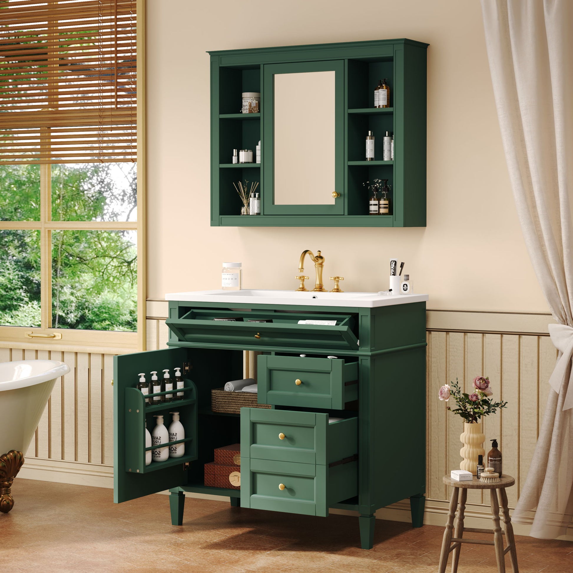 Bathroom Vanity With Top Sink, 2 Drawers And Tip Out Drawer, Mirror Cabinet With 6 Open Shelves - Green