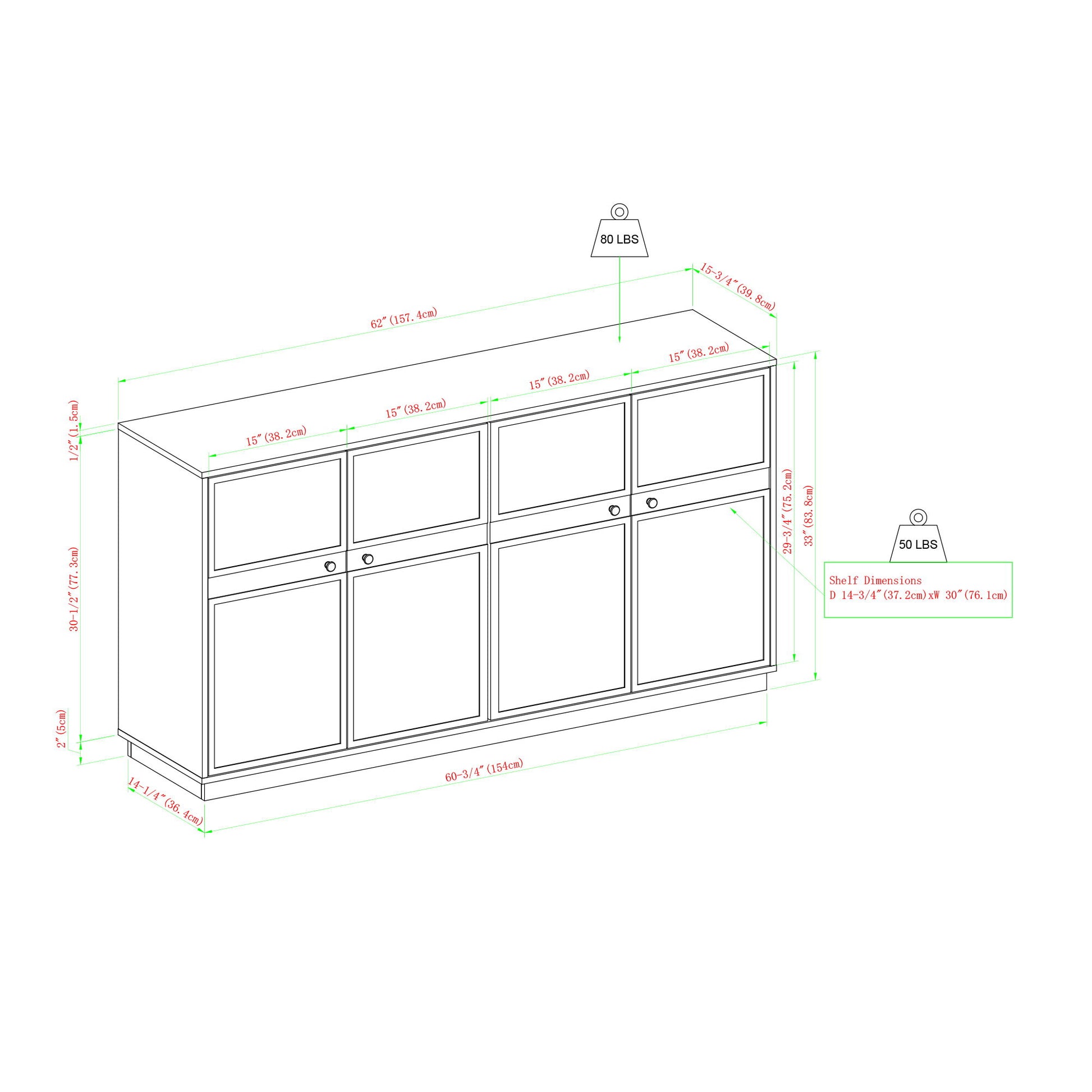 - Adjustable Storage Options: With four doors featuring adjustable soft-close hinges and two adjustable shelves, this sideboard offers customizable storage solutions to suit your needs, providing ample space for organizing and displaying items.