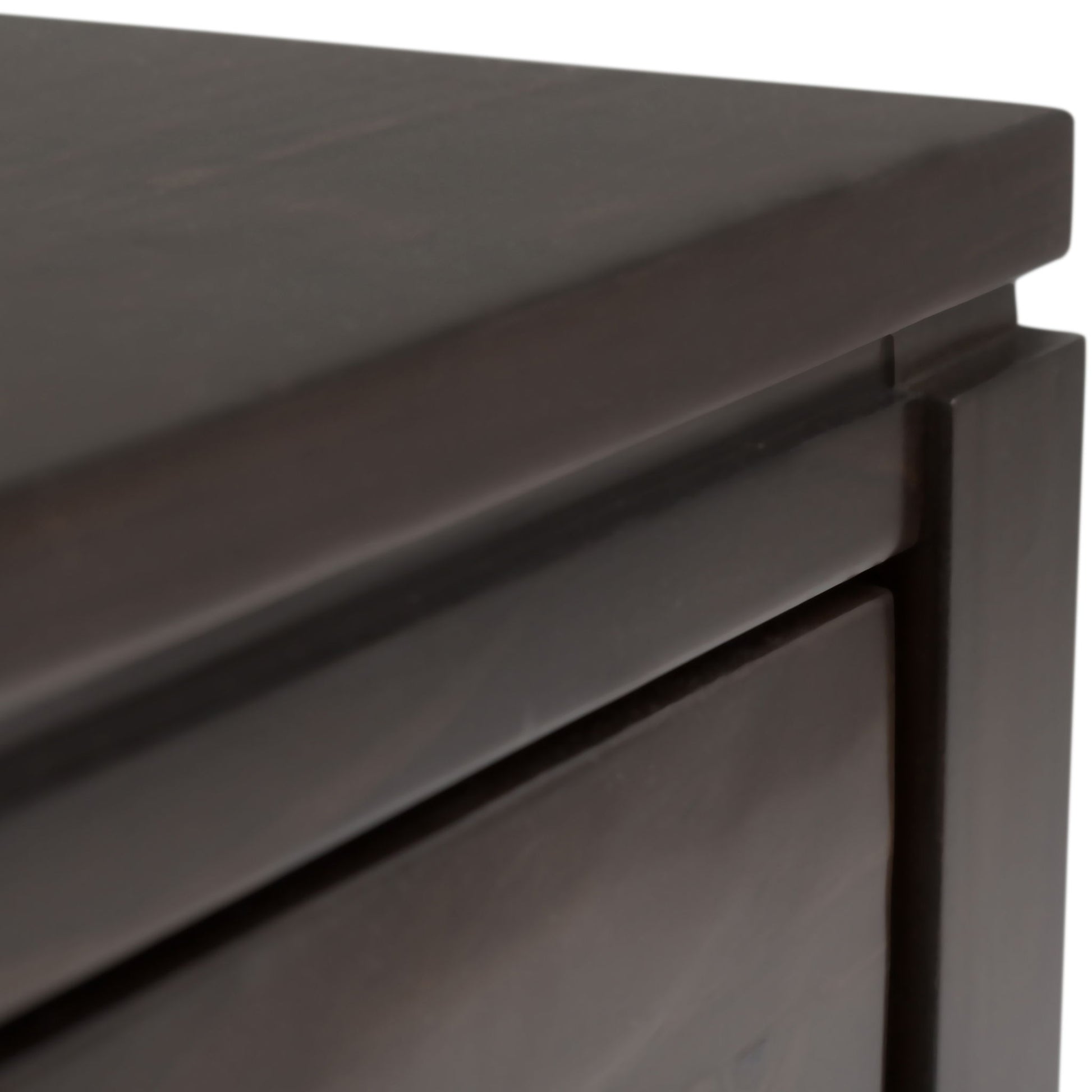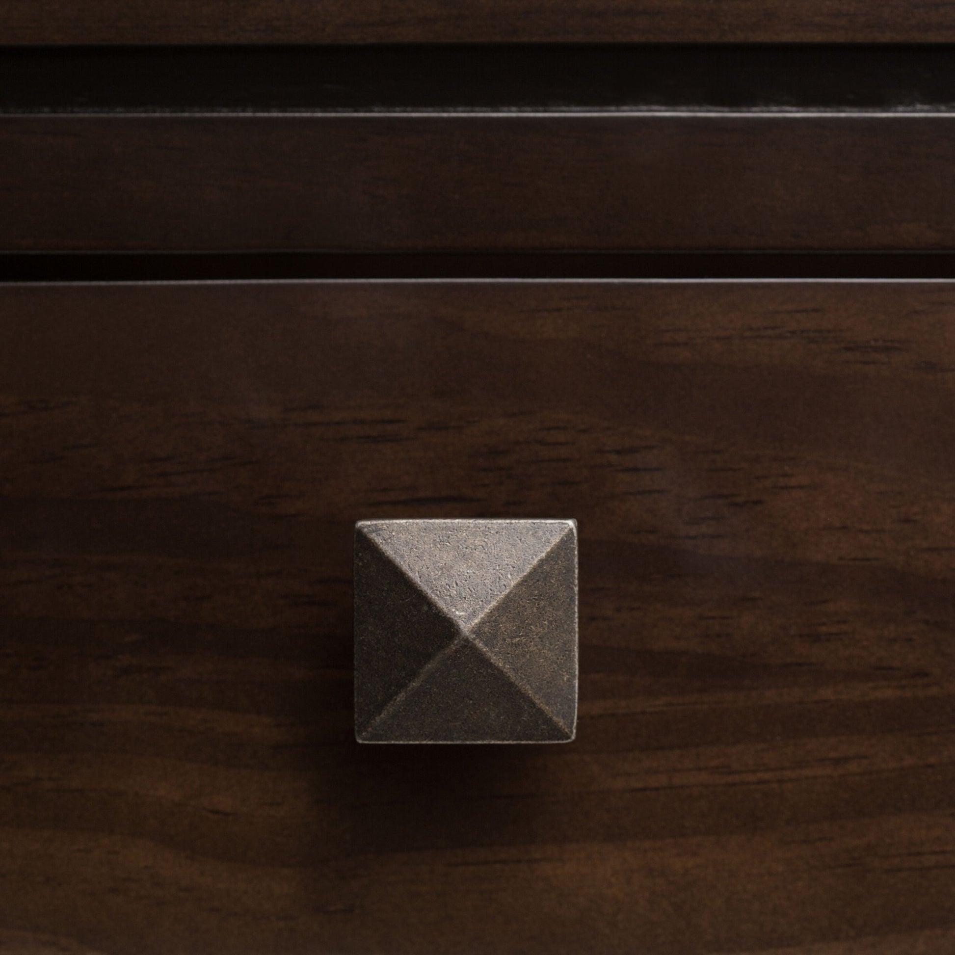 - Contemporary design includes floating square edged top, square knobs with peaked top and square tapered legs.
