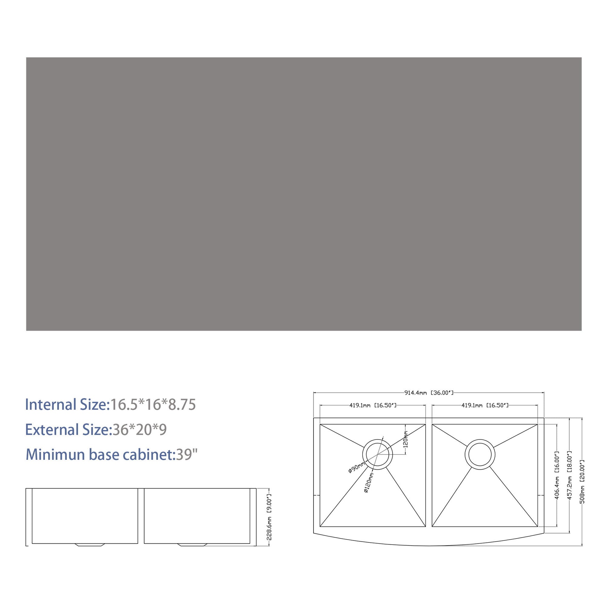 Double Bowl Sink 36" X 20" X 9" Apron Front With 50 / 50 Layout, 16 Gauge T304 Steel - Brushed Nickel