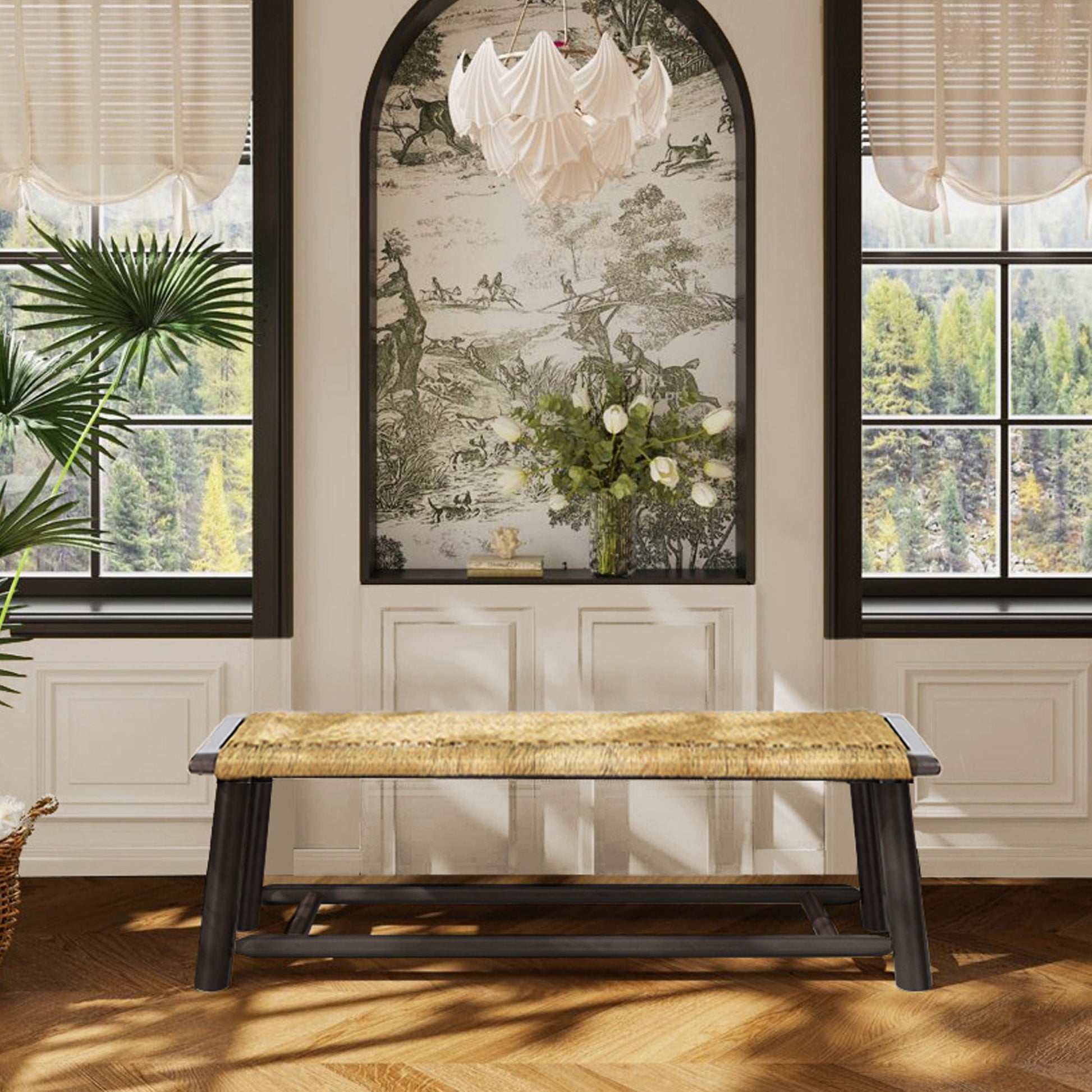 Farmhouse Modern Solid Wood Rattan Bench Multi Functional Design 59" Indoor & Covered Outdoor Bench - Walnut