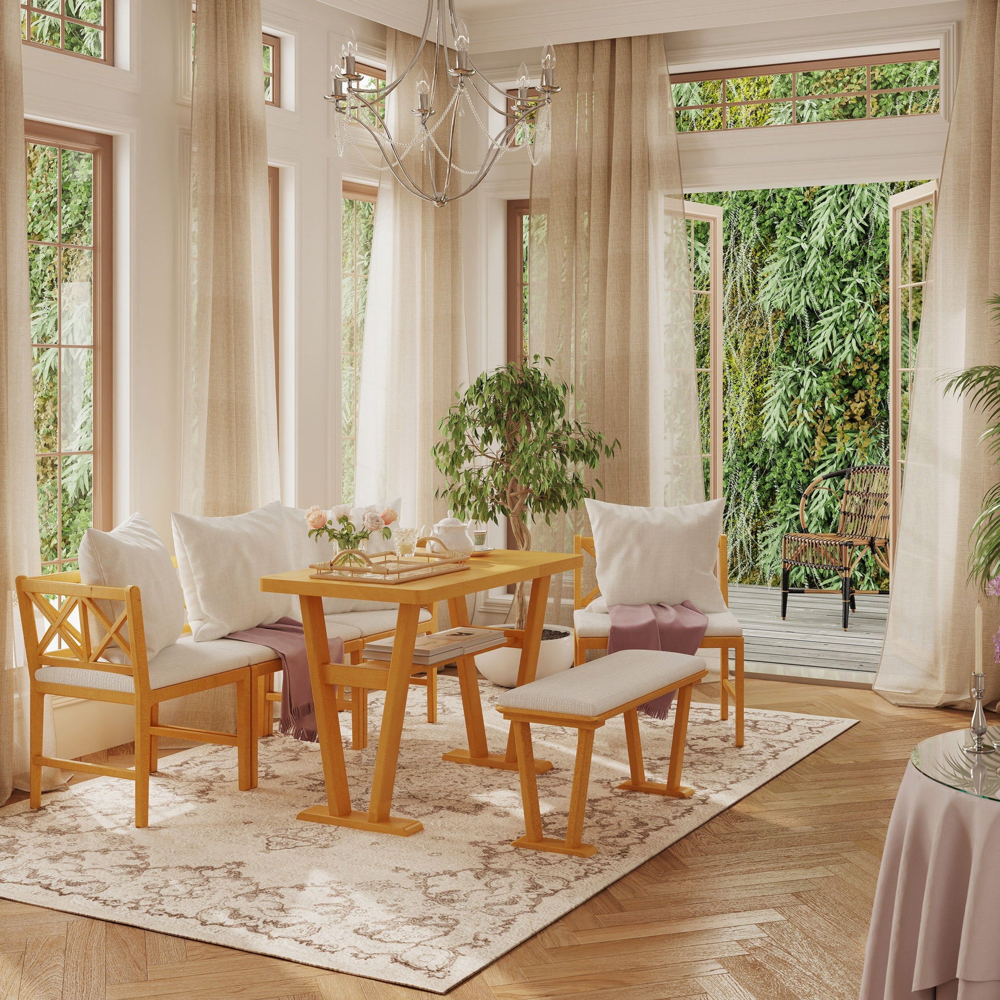 - Comfortable Seating for 4-6: Includes 2 corner armchairs, 2 standard chairs, and 1 soft padded bench for cozy dining.