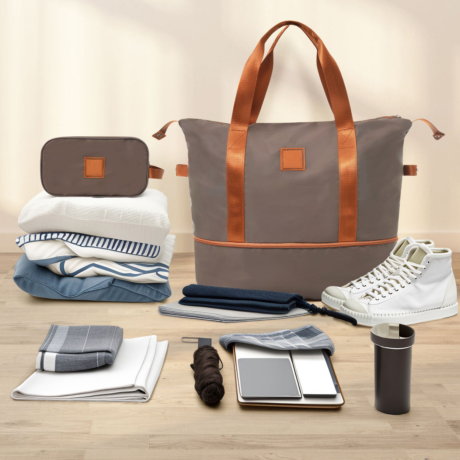 - Comprehensive Luggage Set: This set includes a 20-inch suitcase, a travel duffel bag, and a toiletry bag. The duffel bag features a trolley sleeve with a zippered pocket, allowing for convenient attachment to the adjustable suitcase handle.