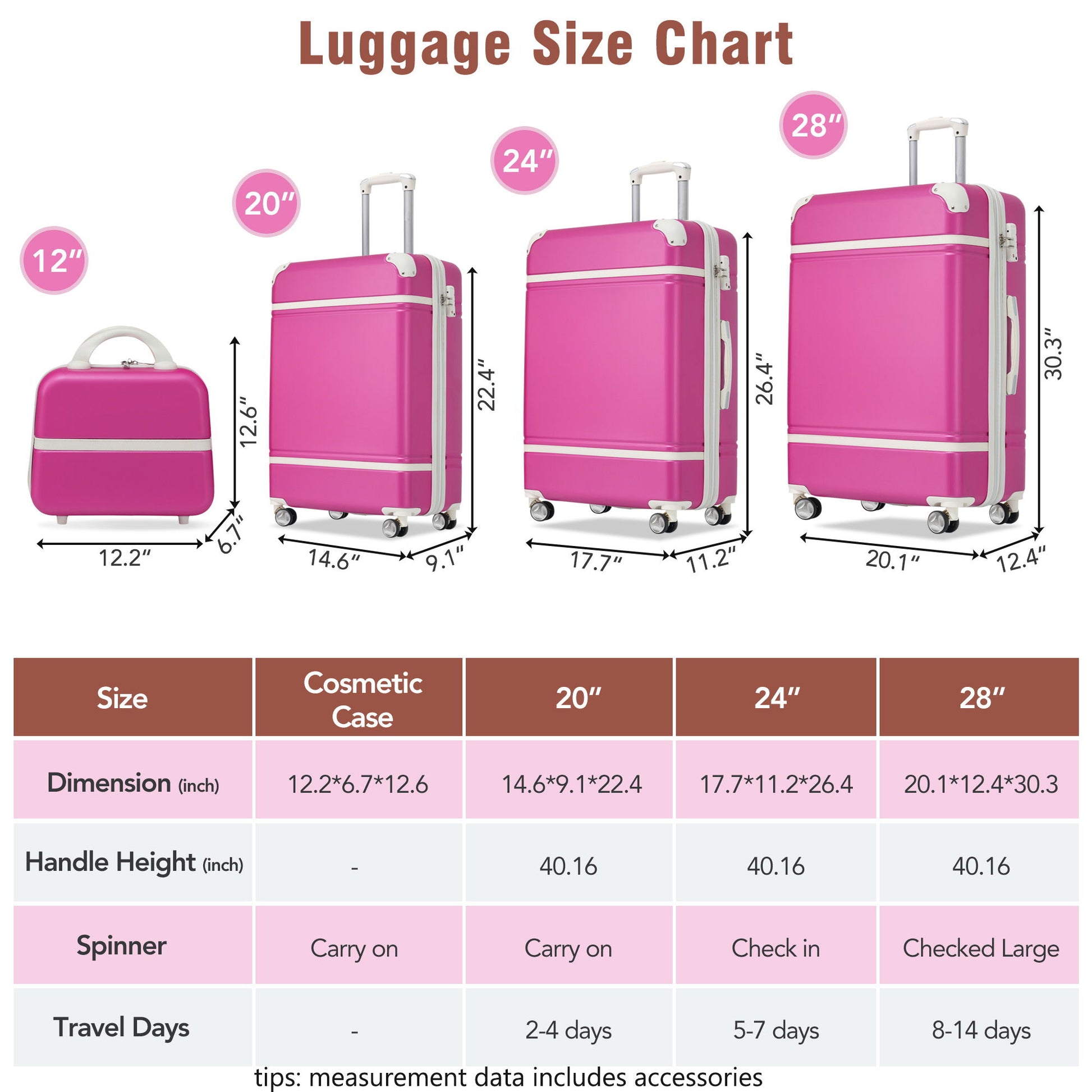 - Complete Set:The luggage set of 4 pieces offers 20" carry on luggage, 24" medium checked luggage,28" large checked luggage and 1 portable cosmetic case,can be nested together for easy storage.