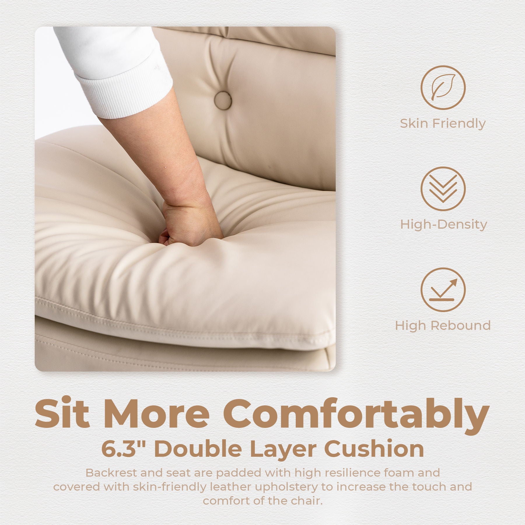 Upholstered by high quality leather and filled with double-layer high density seat cushion which provides broad support and resilience. It feels gentle and skin-friendly, durable and not easy to pilling, wrinkling, and deforming.