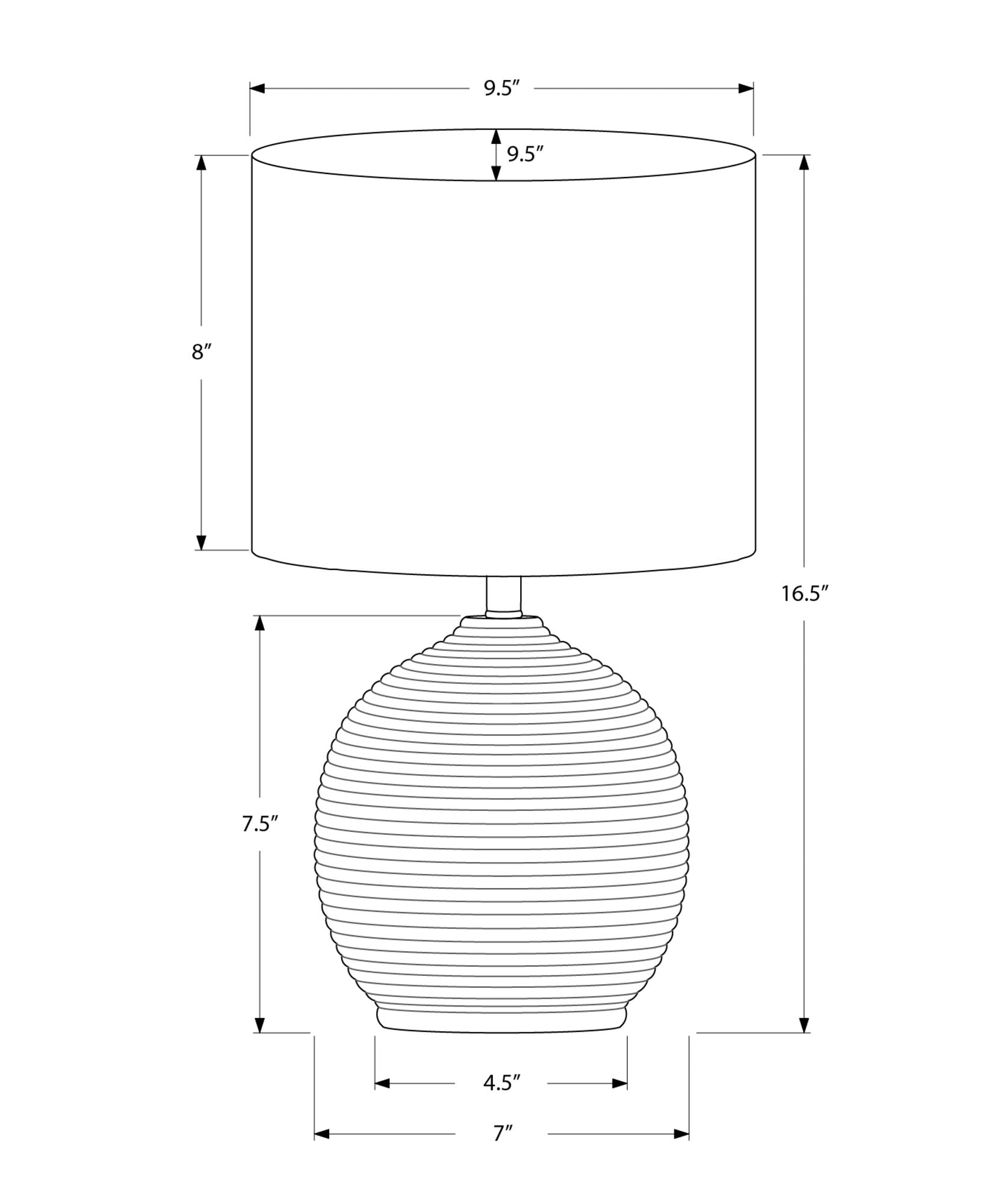 - Product Dimensions: Overall dimensions are 9.5" L x 9.5" W x 16" H with a base of 7" L x 7" W x 7.5" H and a shade of 9.5" L x 9.5" W x 8" H.