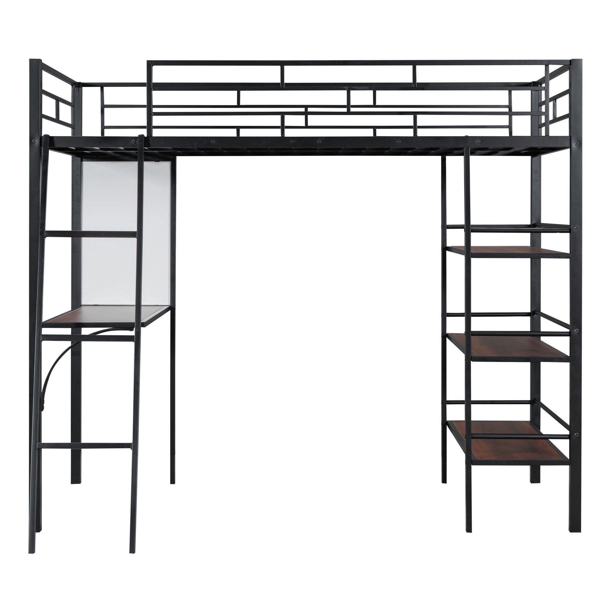 Loft Metal Bed With 3 Layers Of Shelves And Desk, Stylish Metal Frame Bed With Whiteboard