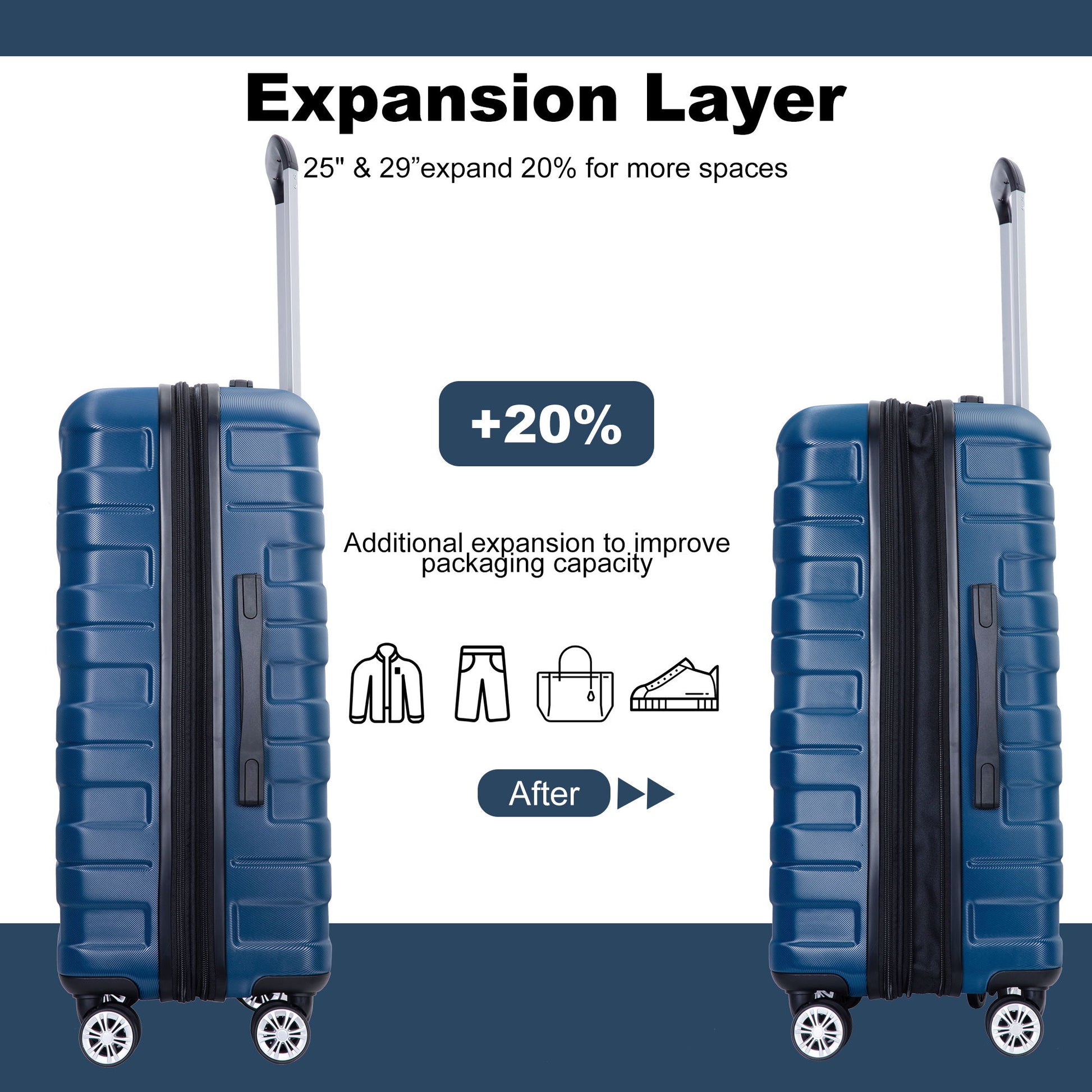 - Comprehensive Set: The 5-piece luggage set includes a 21" carry-on, 25" and 29" checked suitcases, a travel duffel bag, and a toiletry bag. The 29" suitcase and duffel bag feature an expansion zipper for 25% more space.