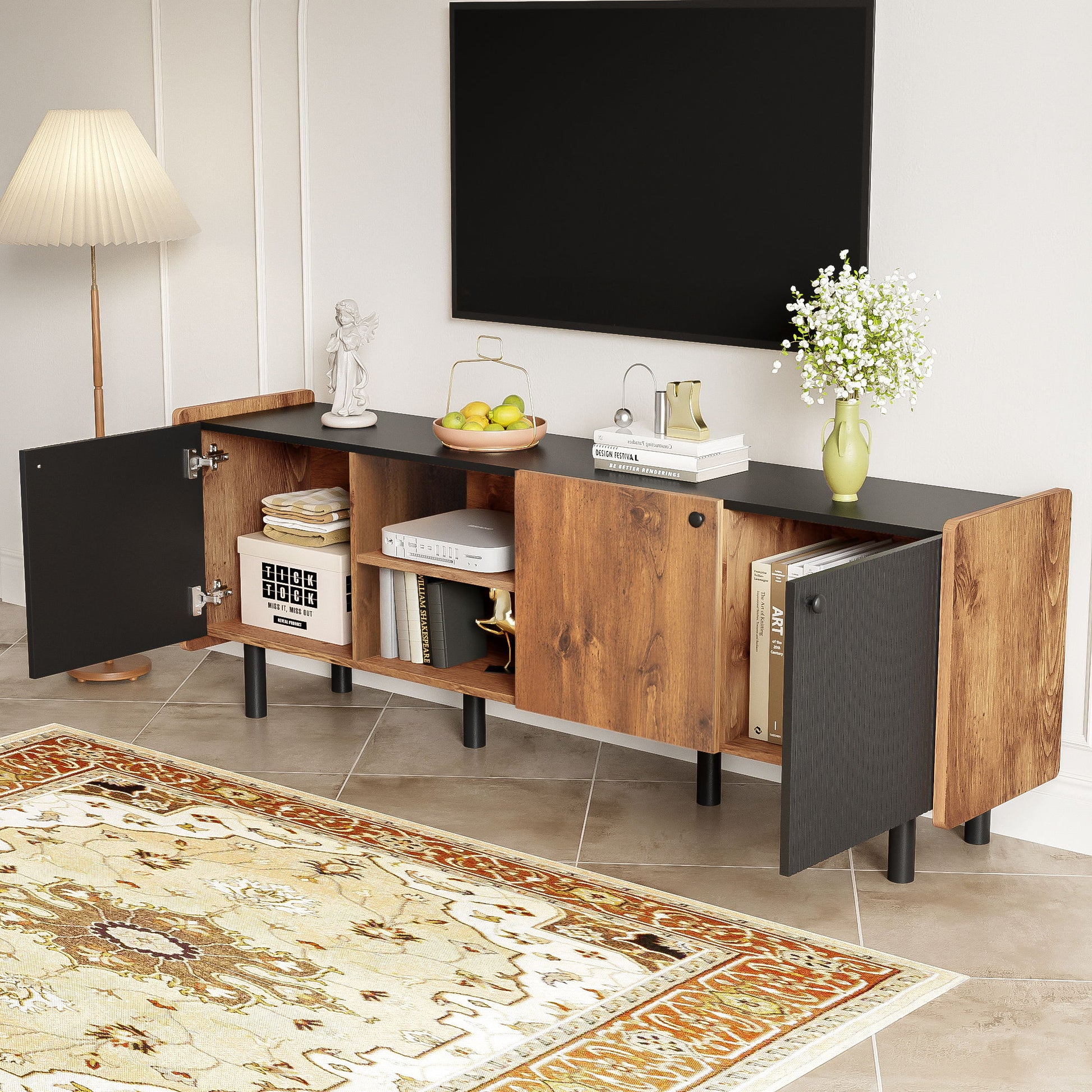 - Ample Storage: Featuring 3 large cabinets and 2 open compartments, this stand provides substantial storage for media essentials, gaming consoles, and DVDs, ensuring an organized entertainment area.