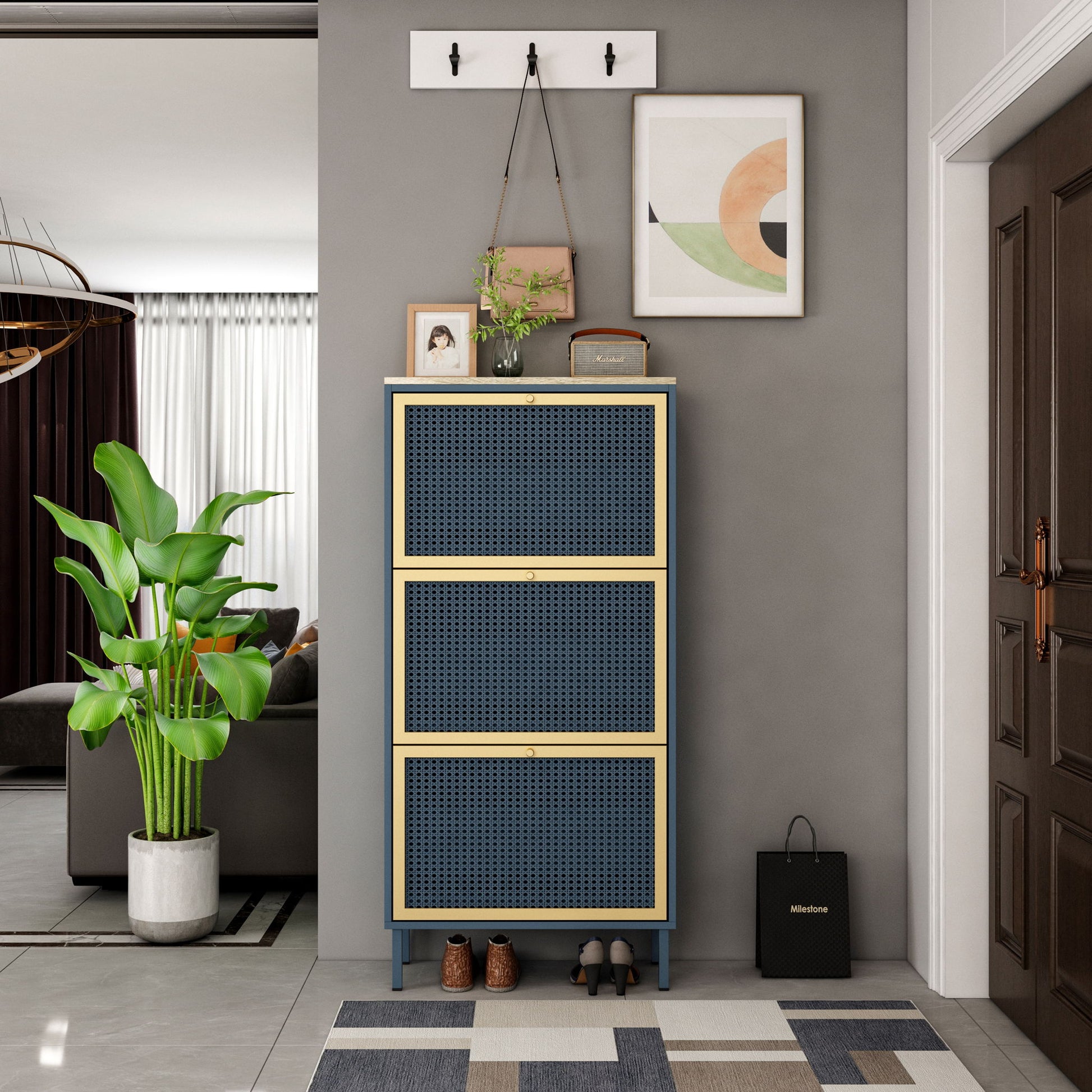 3 Door Metal Shoe Rack, Freestanding Modern Shoe Storage Cabinet With Metal Rattan, Particle Board For Entryway - Blue Gray