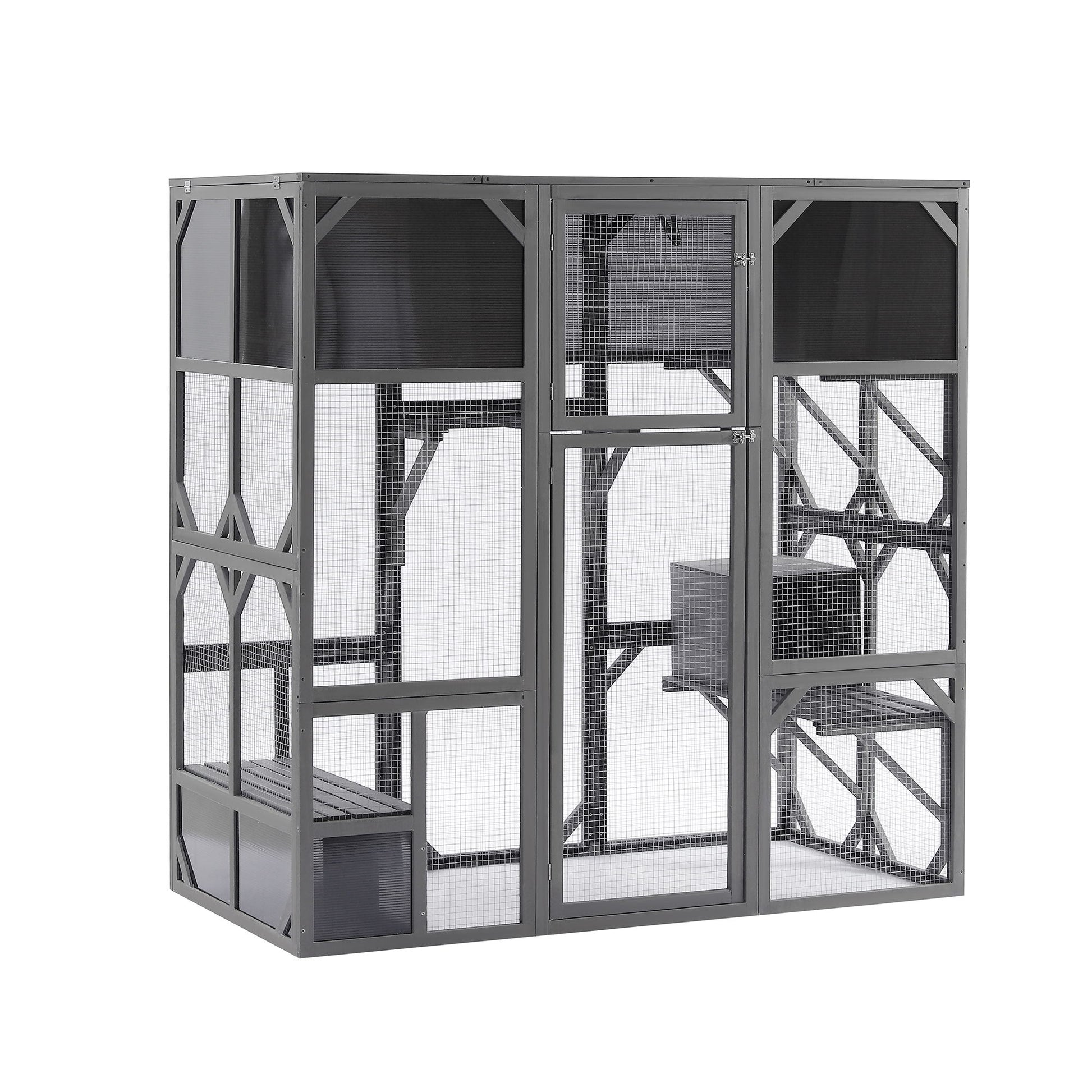Outdoor Wooden Cat House Catio Enclosure With Super Large Enter Door Cat Kennel With Bouncy Bridge, Platforms And Small Houses Walk In Kitten Cage With Sunshine Board - Dark Gray