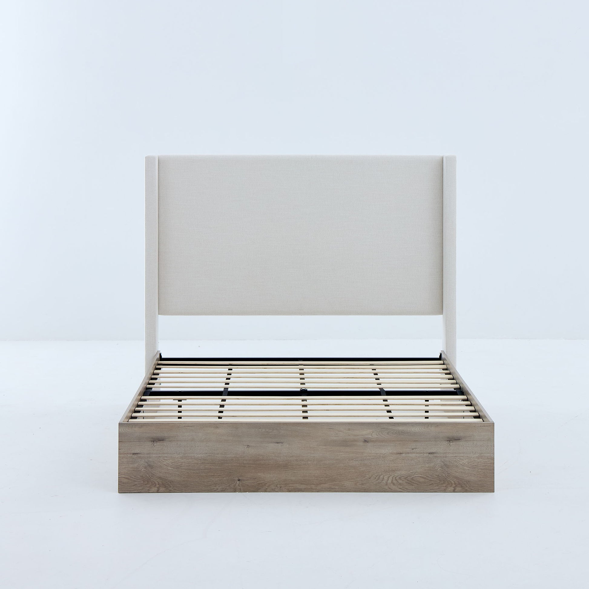 Shelton - Queen Upholstered Wingback Bed With 54" High Headboard - Ivory / Light Gray / Camel Oak