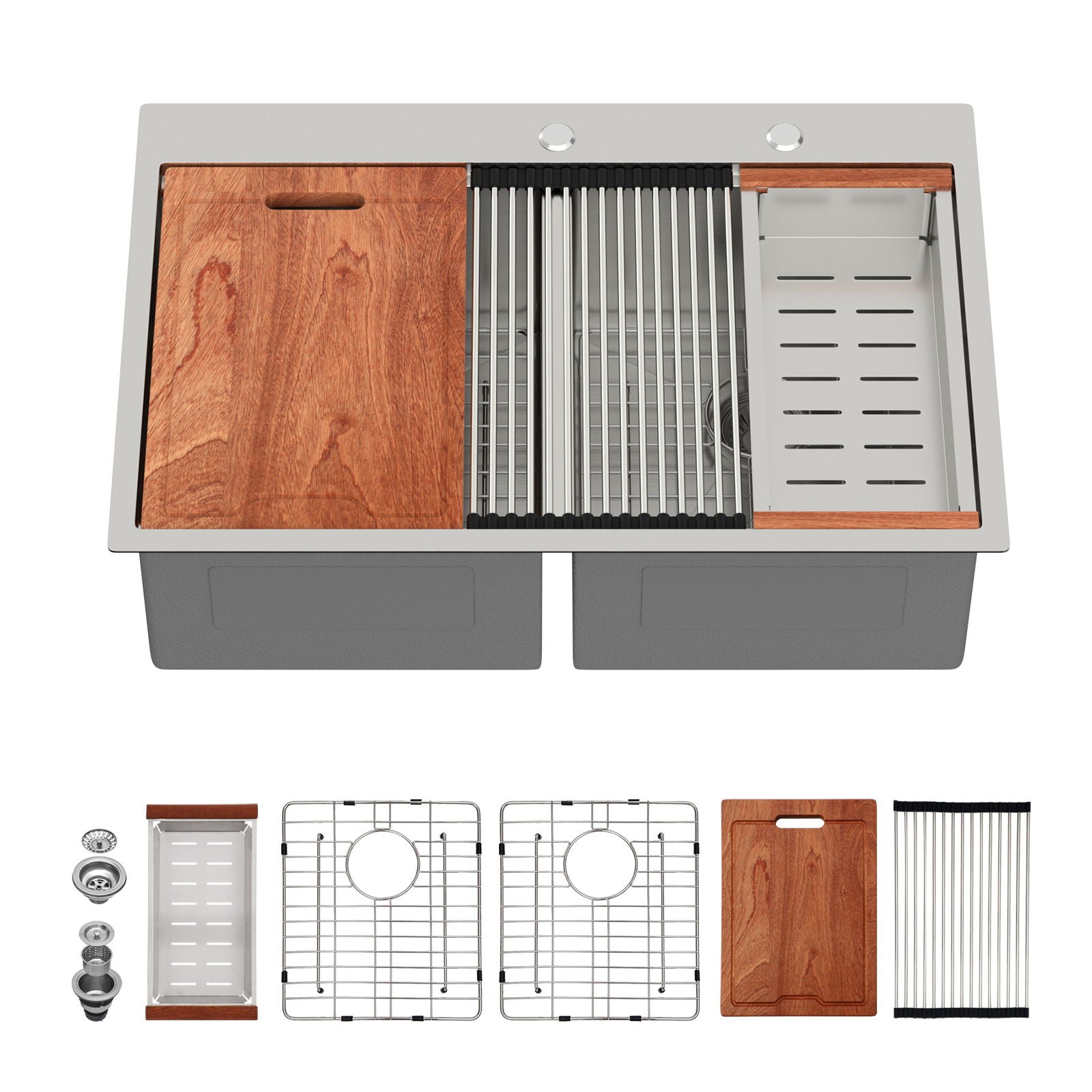 - Dimensions: Exterior size 33" x 22" x 10" with 15" x 16.62" bowls each; fits standard 3-1/2" drain and most garbage disposals